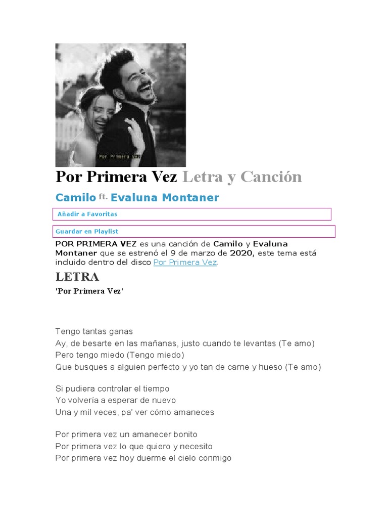 Camilo y Evaluna relatan su amor y lo felices que estĆ”n en su. TambiĆ©n puedes escuchar la canción Por Primera Vez de Camilo con el vĆdeo musical que te proporcionamos en esta pĆ”gina. One and a thousand times to see how you wake up Chorus.
